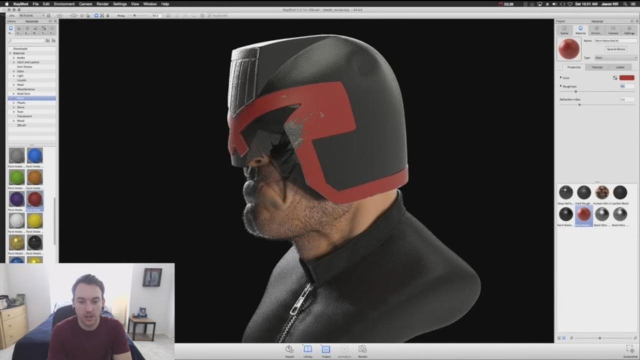 As shown in the video, the bust of Judge Dredd was accomplished using ZBrush, Keyshot and Photoshop. Many of the details like the texture map cannot be efficiently done in just one software application. The image had to be bridged, opened and switched around in different applications to get the final product. In Keyshot, for instance, rendering the image can easily be done using different “assets” like colors, reflections and lightings. The skin tone and texture can also be easily edited using Keyshot. You can tweak the parameters until you achieve the image that you need or want.
